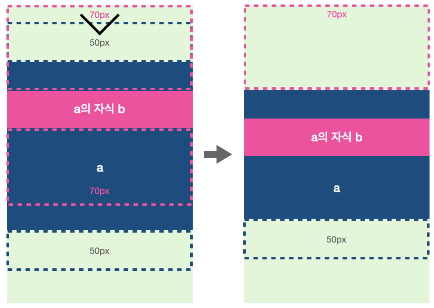 따라서 b 태그의 마진값 > a 태그의 마진값이므로 b 태그의 마진값이 적용되어 a, b 사이의 마진값은 70px이 됩니다.