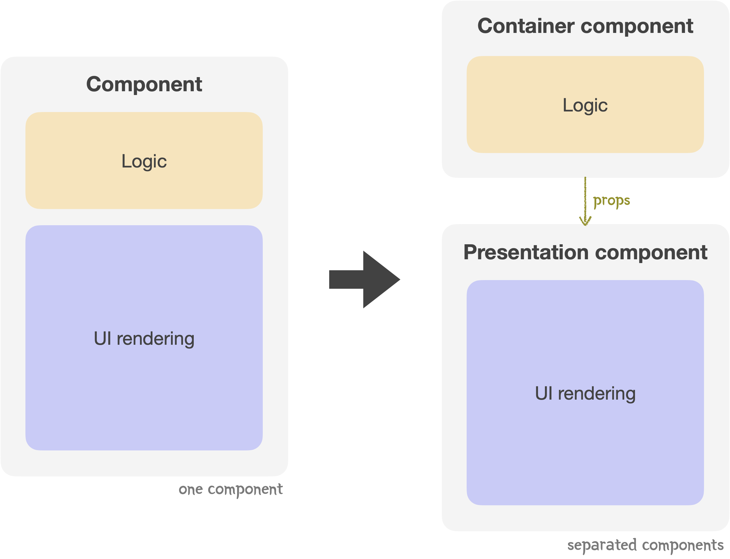 만약 역할을 분리하지 않고 하나의 컴포넌트 안에 뷰와 로직을 담당하는 코드를 구현한다면, 해당 컴포넌트는 재사용이 어려워지고 의존도가 높아지게 됩니다.