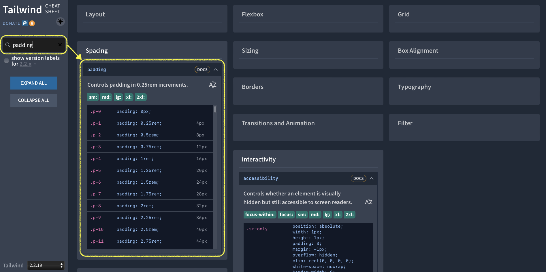 검색창에 알고 싶은 css 속성을 입력하면 그에 맞는 테일윈드의 유틸리티 클래스를 알려줍니다.
