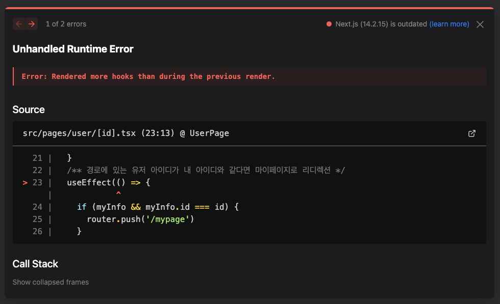 그러나 다음 사진과 같이 'Error: Rendered more hooks than during the previous render.'이라는 오류가 발생하였습니다.