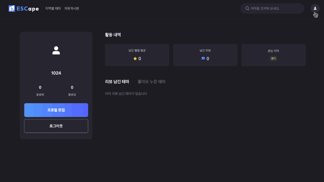 마이페이지에서 내가 '리뷰 남긴 테마'와 '좋아요 누른 테마'로 구성된 탭을 눌렀을 때, 눌린 탭별로 테마 리스트가 업데이트되어야 합니다.