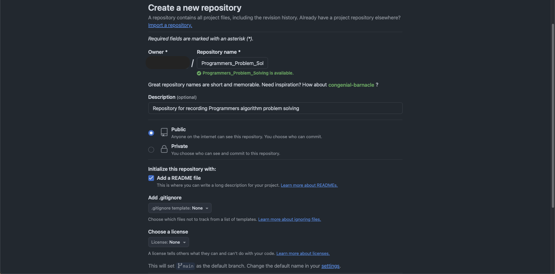 저는 'Programmers_Problem_Solving'이라는 이름으로 생성하였습니다.