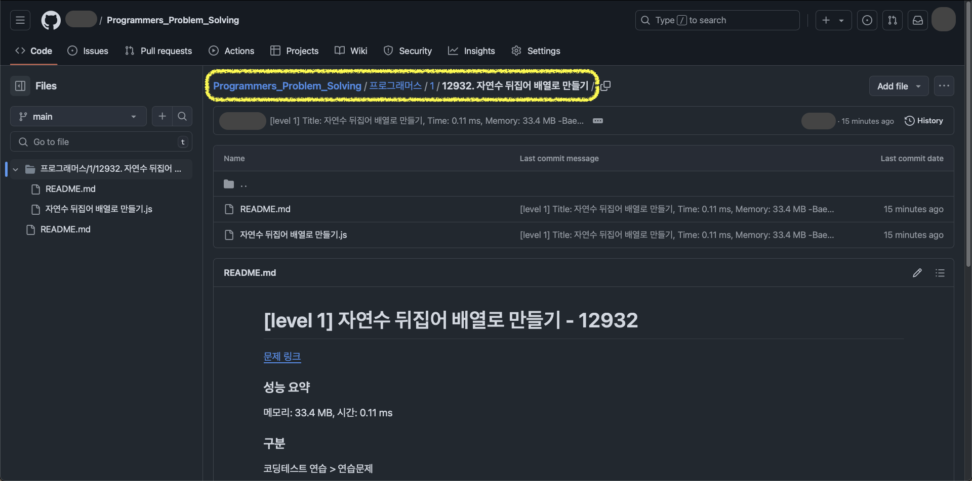 아까 연결해 둔 깃허브의 레포지토리에 들어가면 내가 제출한 답안의 코드와 정보가 자동으로 커밋되어 있는 것을 볼 수 있습니다.