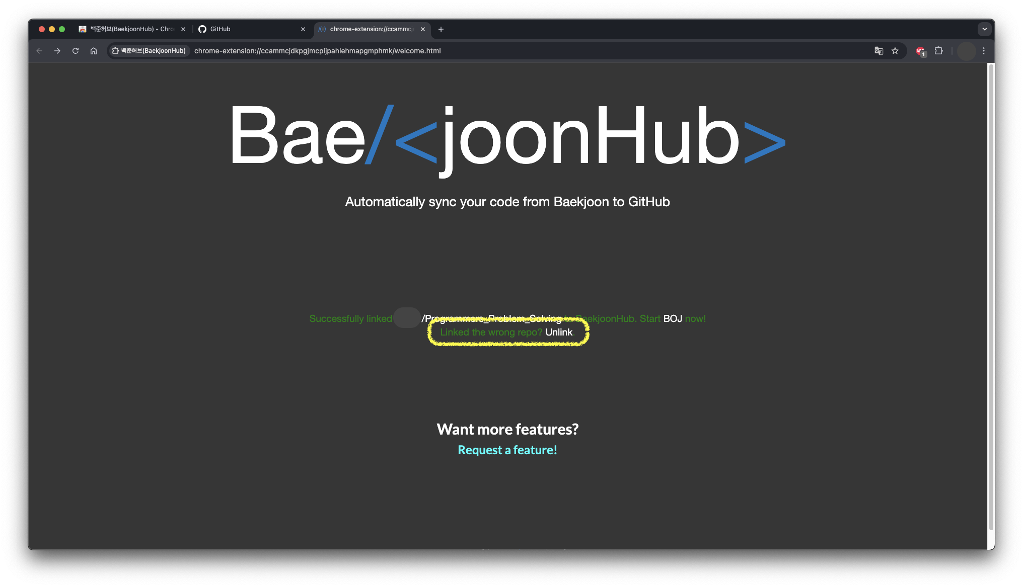 잘못된 레포지토리를 연결한 경우 'Unlink'를 눌러 다시 연결할 수 있습니다.