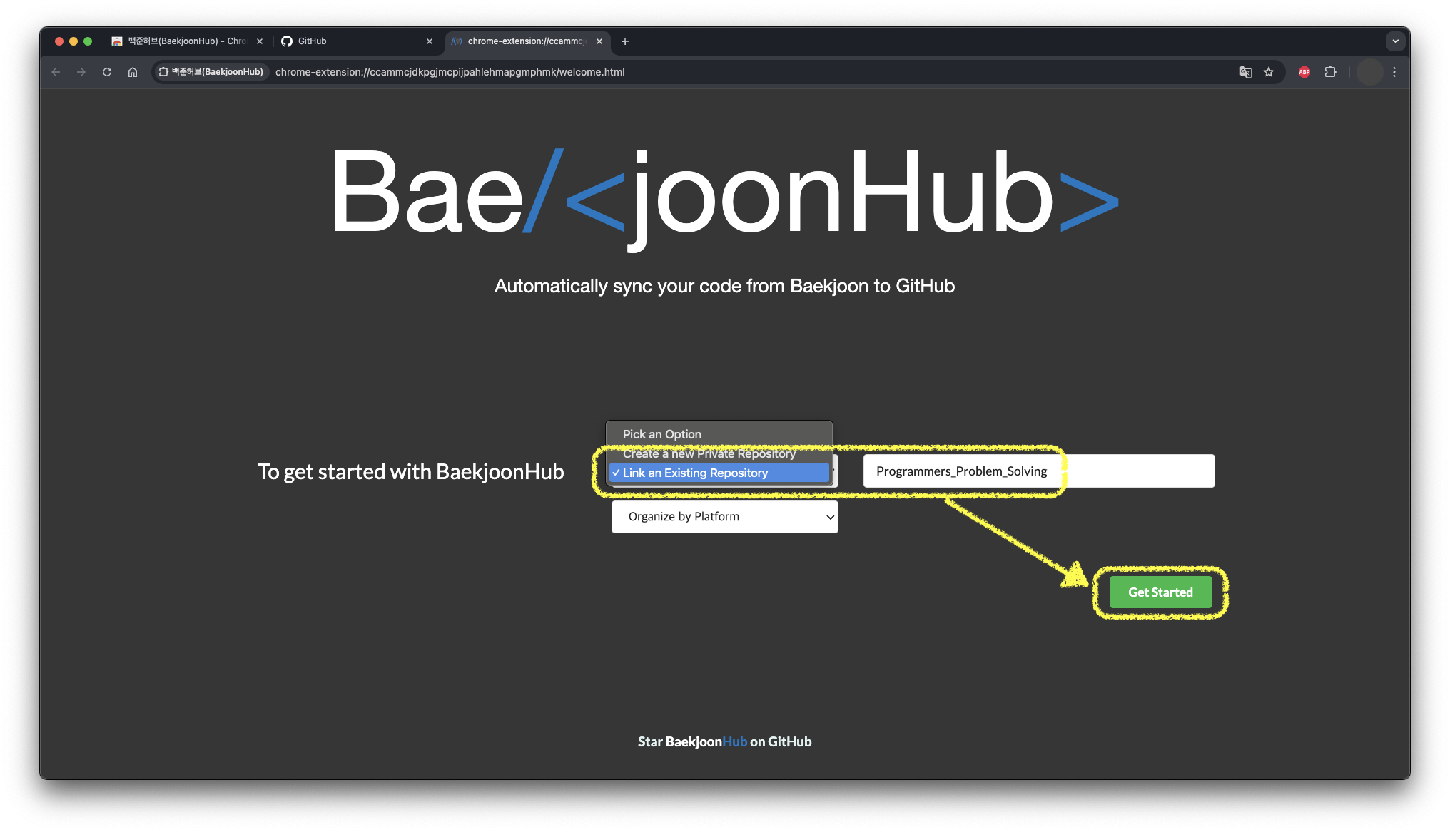 레포지토리 이름을 입력한 뒤 'Get Started' 버튼을 눌러 연결해줍니다.