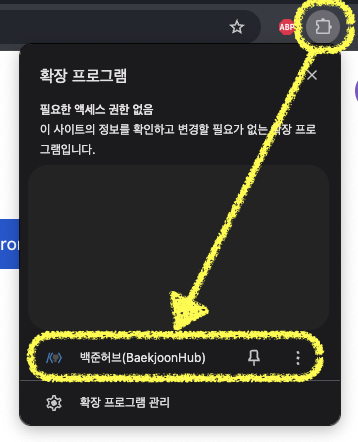페이지 오른쪽 상단에 위치한 퍼즐 아이콘(확장 프로그램 목록 보기)을 눌러 '백준허브' 프로그램을 클릭합니다.