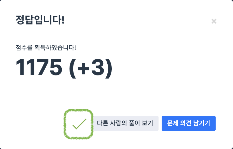 정확한 답안을 제출하면 아래의 사진처럼 확장 프로그램이 초록색 체크 표시를 띄워줍니다.
