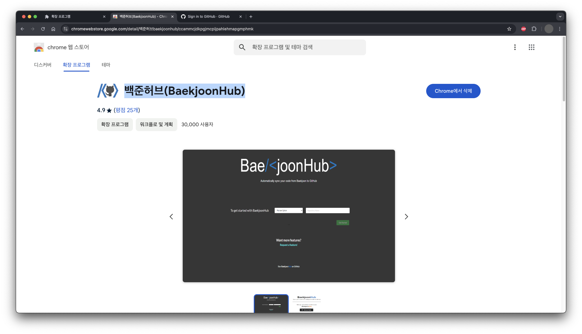 크롬 웹 스토어에서 '백준허브(BaekjoonHub)'라는 이름의 확장 프로그램을 설치해줍니다.