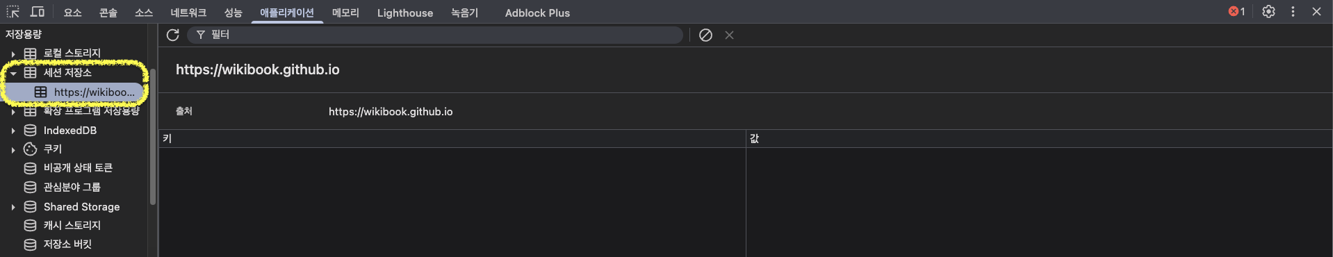 개발자 도구에서 확인한 세션 스토리지에 데이터가 저장되어 있는 모습입니다.