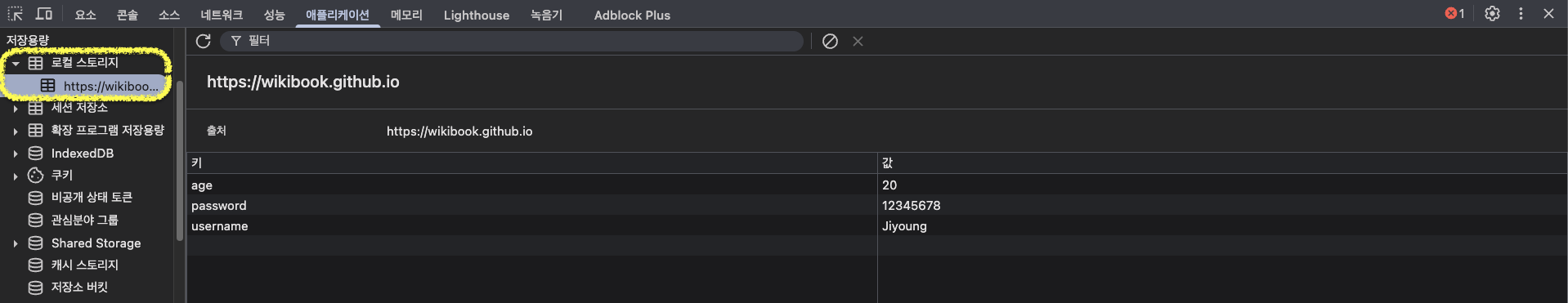 개발자 도구에서 확인한 로컬 스토리지에 데이터가 저장되어 있는 모습입니다.