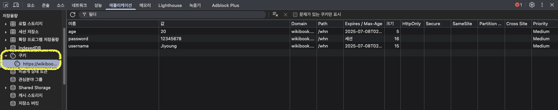 개발자 도구에서 확인한 쿠키가 저장되어 있는 모습입니다.