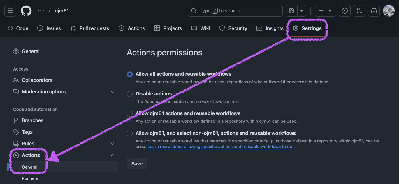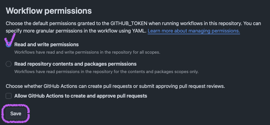 레포지토리의 설정 탭에 들어가 'Setting -> Actions -> General' 메뉴의 가장 마지막 항목인 'Workflow permissions' 항목을 'Read and write permissions'로 설정하고 저장합니다.