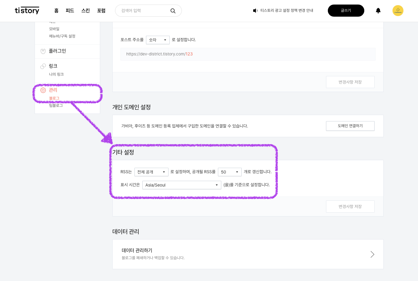'블로그 관리 페이지 - 관리 탭 - 블로그 항목'에서 기타 설정을 사진과 같이 변경해줍니다.