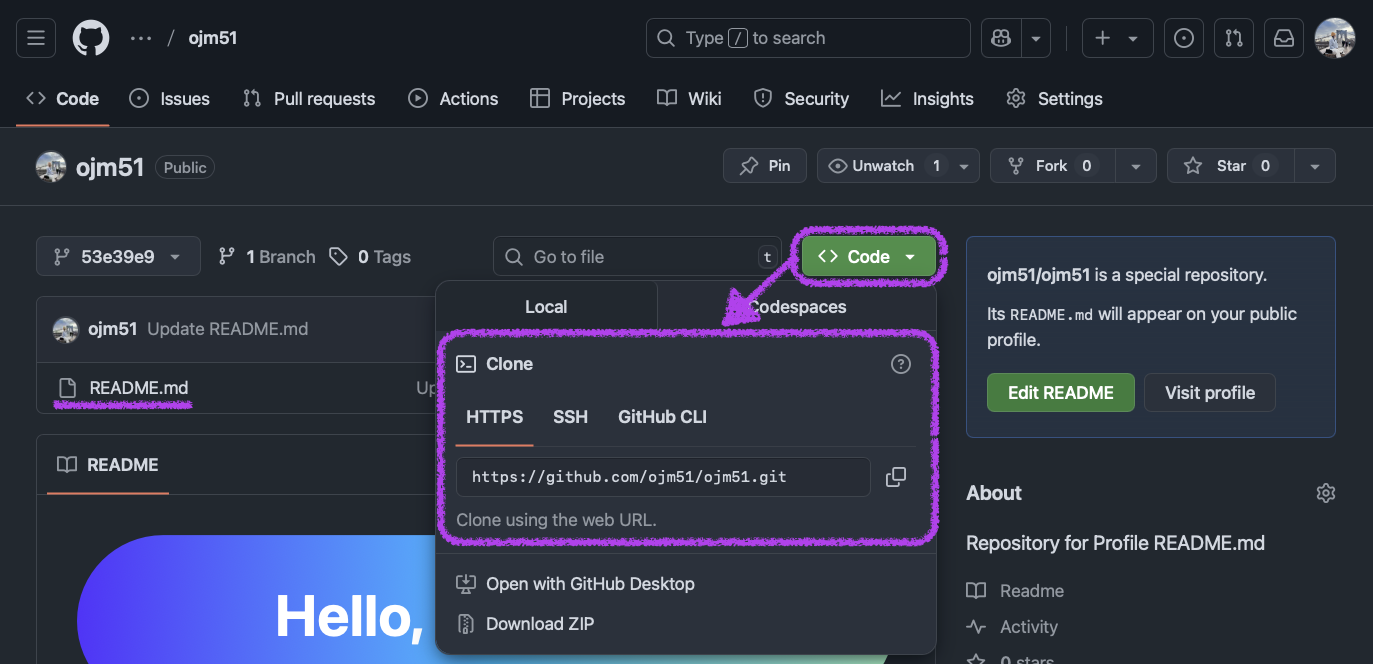 깃허브에서 README.md 파일이 있는 폴더를 클론해옵니다.