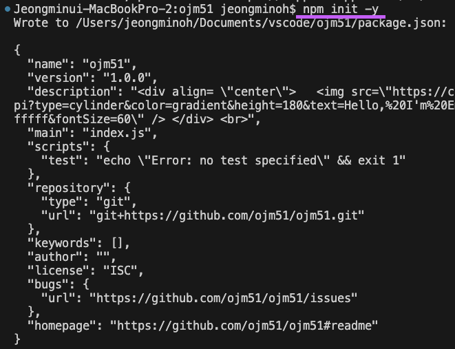 첫 번째로, Node.js 프로젝트로 만들고 기본 설정을 가진 package.json 파일 생성 위한 명령어입니다.