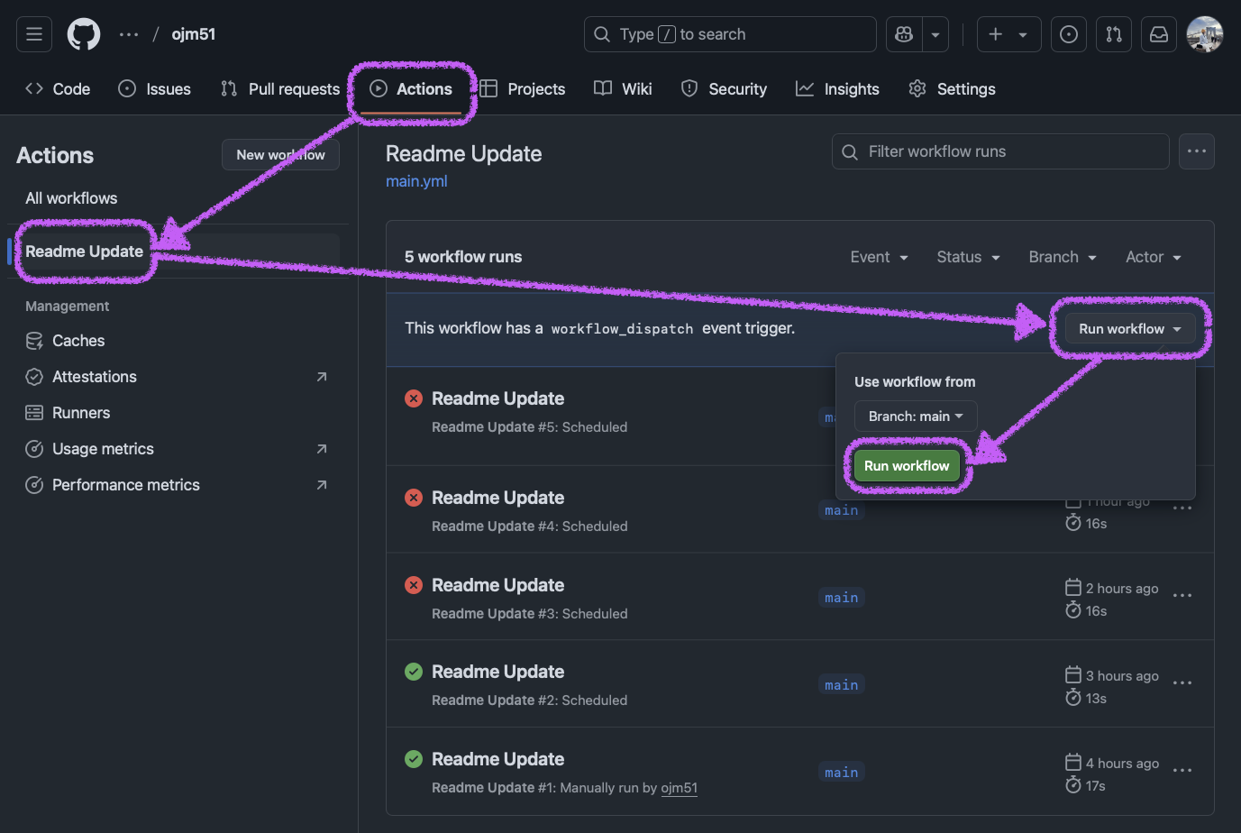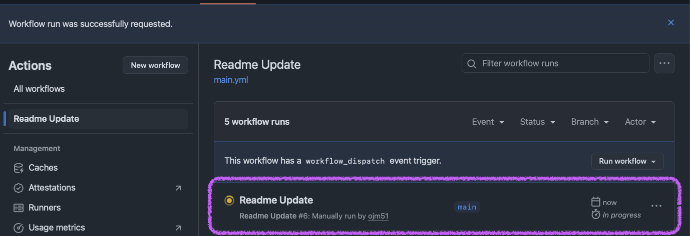 그리고 워크플로우를 수동으로 동작시킬 수 있는 'Run workflow' 버튼을 눌러 업데이트가 잘 동작하는지 테스트해봅니다.
