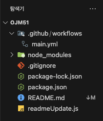 루트 디렉토리에서 'readmeUpdate.js' 라는 이름의 자바스크립트 파일을 새로 생성하고, 다음과 같은 내용을 작성합니다.