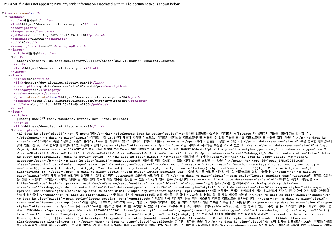 잘 설정되었다면 '자신의_블로그_주소/rss'로 접속 시 다음과 같은 화면이 보입니다.