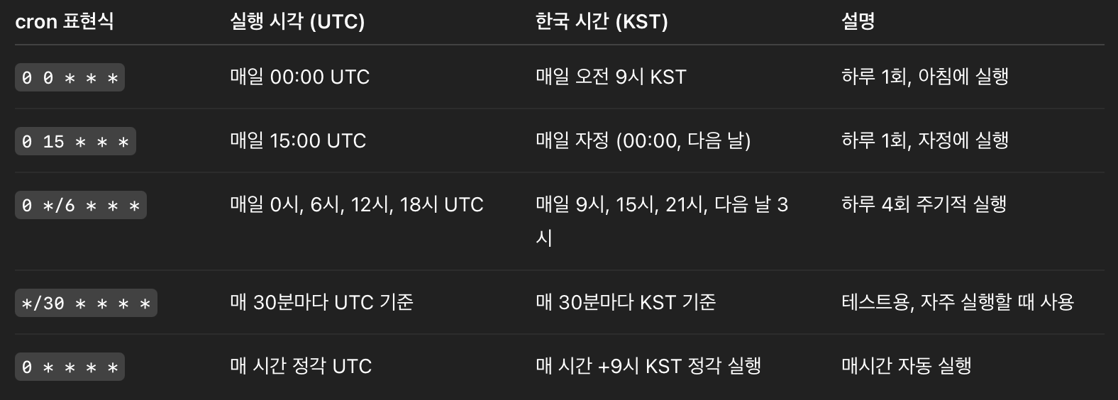 아래의 cron 표현식 표를 참고하여 원하는 주기를 설정할 수 있습니다.