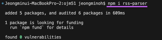 두 번째로, RSS 정보를 파싱할 수 있는 rss-parser 라이브러리를 설치하는 명령어입니다.