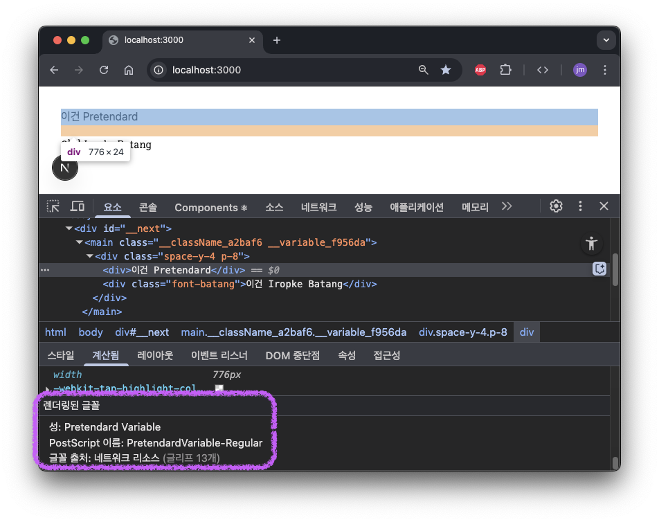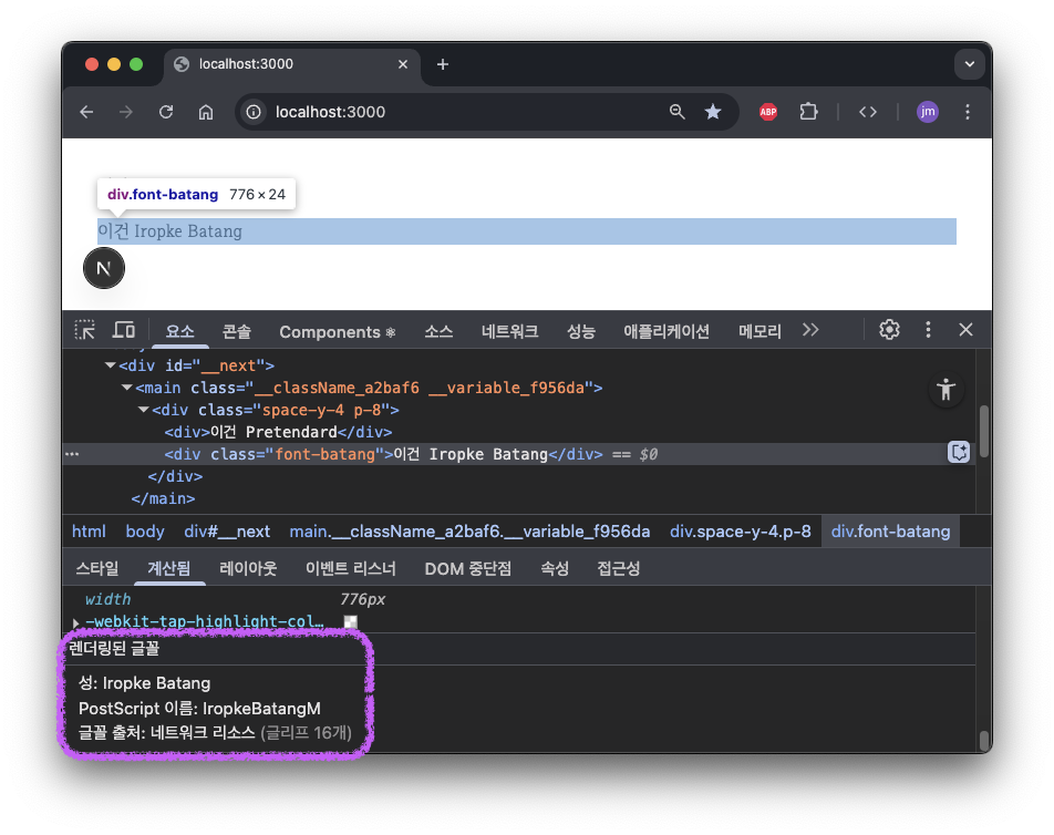 전역 폰트로 설정한 Pretendard는 따로 지정해주지 않아도 적용되고, 두 번째 div에만 className으로 이롭게 바탕체를 적용했습니다.